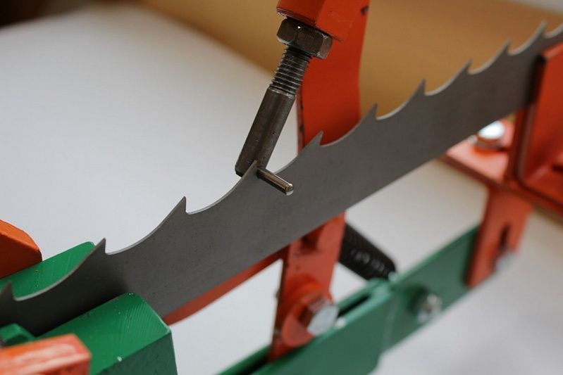 Зубья пилы разводятся одновременно в следующем порядке: разводка зуба влево, прямо (без разводки) и затем разводка зуба вправо, то есть за одно движение рычага у вас обрабатывается три зуба -вправо, влево и прямо. Далее лента в автоматическом режиме перемещается на следующие три зуба.