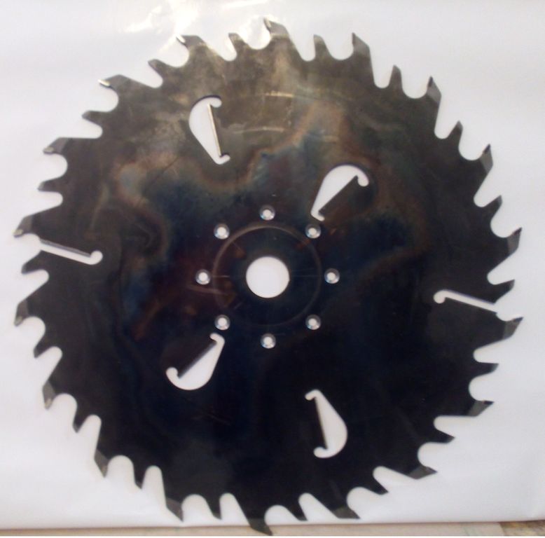 Пильный диск диаметром 560 мм имеет 24 зубьев с твердосплавными напайками и 24 промежуточных укороченных зубьев без напаек. На корпусе пильного диска расположено 6 подрезных ножа с напайками. Посадочный диаметр диска 50мм, возможна поставка пильных дисков с другими посадочными диаметрами.