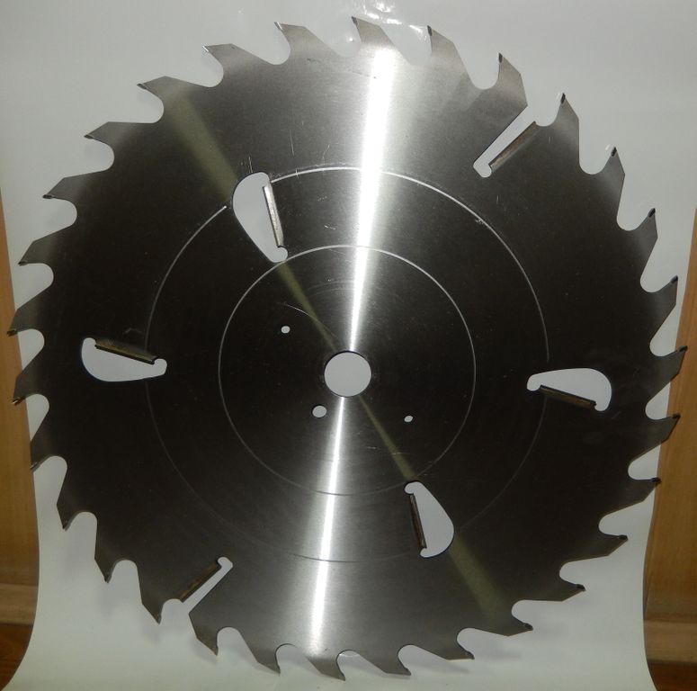 Пильный диск диаметром 750 мм имеет 24 зубьев с твердосплавными напайками. На корпусе пильного диска расположено 8 подрезных ножа с напайками. Посадочный диаметр диска 50мм, возможна поставка пильных дисков с другими посадочными диаметрами.