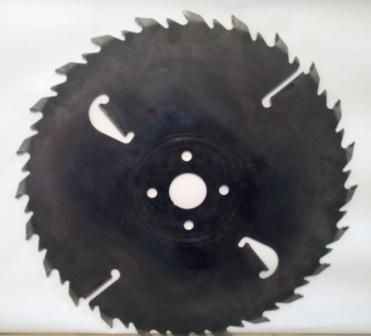 Пильный диск диаметром 450 мм имеет 24 зубьев с твердосплавными напайками и 24 промежуточных укороченных зубьев без напаек. На корпусе пильного диска расположено 4 подрезных ножа с напайками. Посадочный диаметр диска 50мм, возможна поставка пильных дисков с другими посадочными диаметрами.