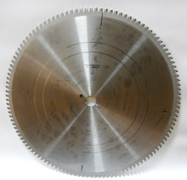 Диаметр пильного диска 500мм, посадочный диаметр 32мм (возможно изменить диаметр по заказу), количество зубьев с твердосплавными напайками 120 штук. Толщина тела пилы 3,2мм, толщина пилы по напайке 4 мм.